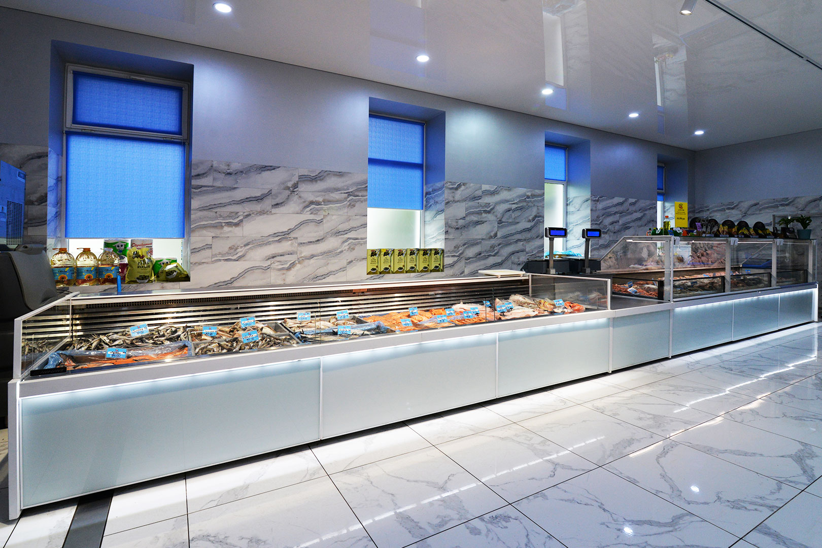 Low-temperature cabinets Missouri MC 120 LT PS 130-DLM, Missouri MC 120 LT self 086-DLM, neutral module Missouri NC 120 cash desk 085, Dary Morya market, Ukraine