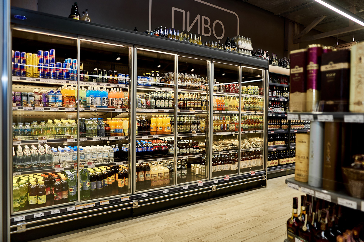 Wall-sited display cabinets “Louisiana D” having energy-saving glass doors are used in the sales area for the sale of packaged gastronomy, preserves and beverages. The line of wall display cabinets for dairy products is additionally equipped with advertising light boxes.