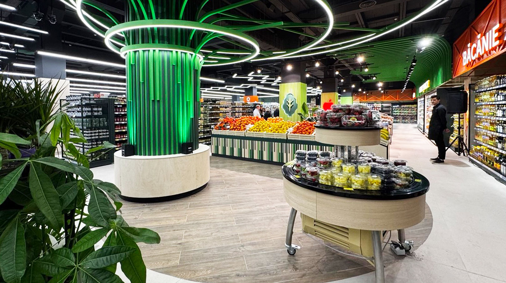 The new Bonus supermarket in Moldova features a well thought-out design approach, with refrigerated cabinets and counters playing a key role in organizing the space and presenting the product range.