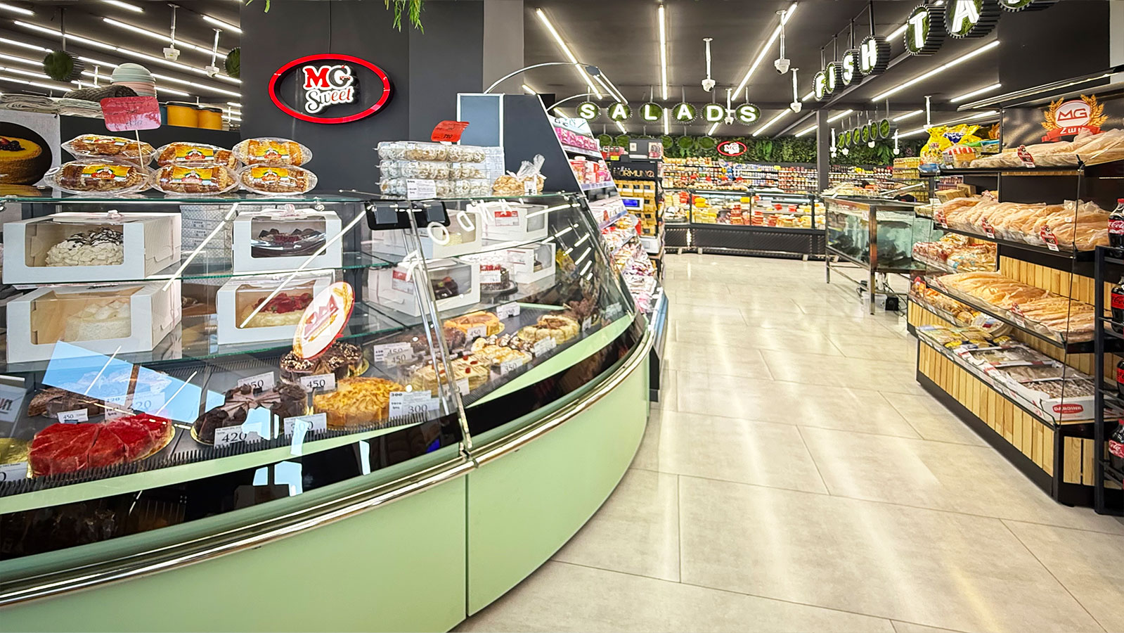 Niskie regały Louisiana eco MSV 095 MT O 160-DLM, lady cukiernicze Dakota sapphire KA 090 patisserie PS 140-DLA-ER35, supermarket MG, Armenia